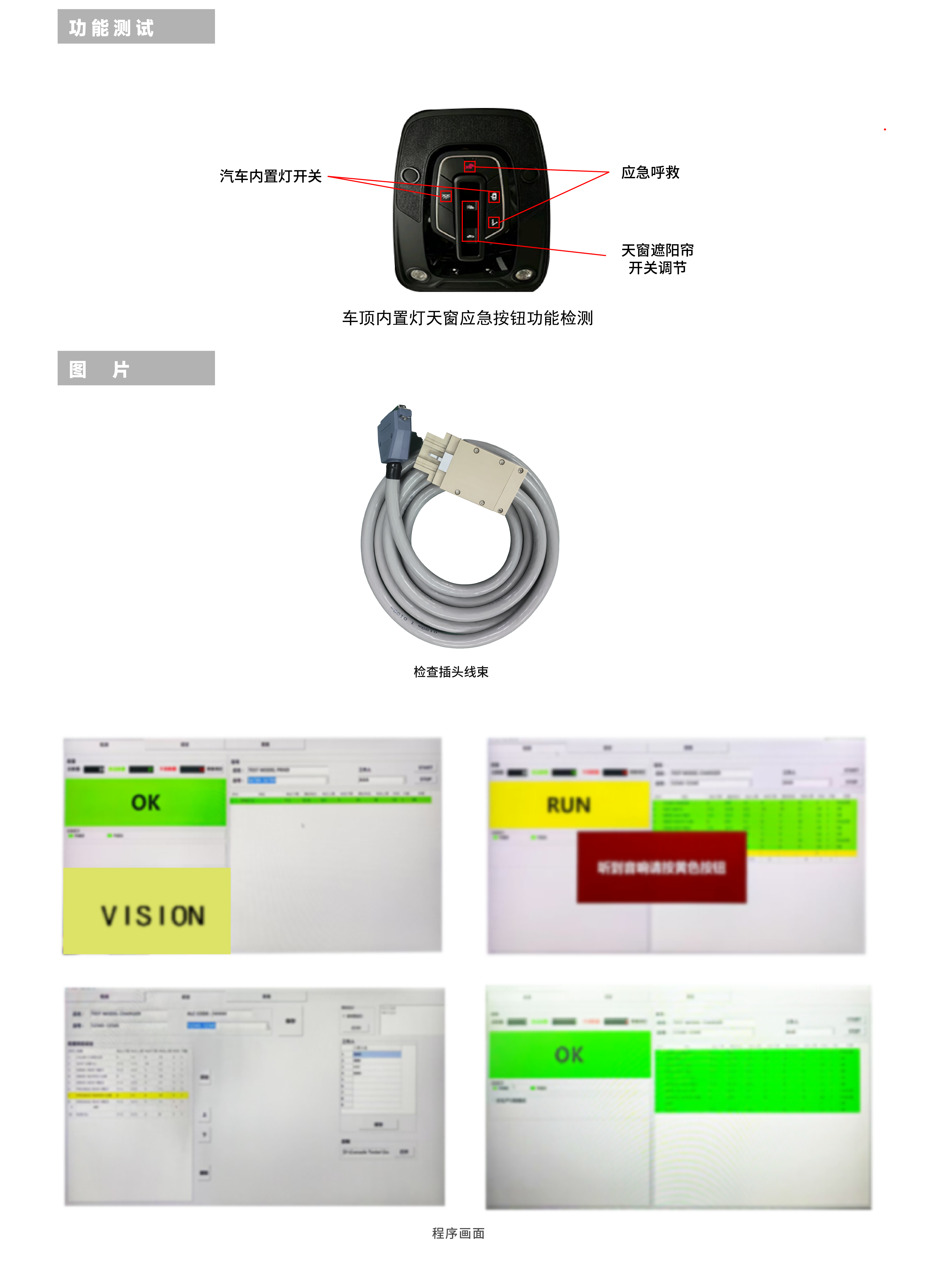 汽车顶内置灯天窗按键通电检测机 • 创造测试环境,可通电检测汽车顶内置灯天窗遮阳帘按键的功能,主要检测: - 汽车内置灯开关,天窗遮阳帘开关调节,应急呼救等按键 • 可检测LIN/CAN通信连接的部品功能• 支持与MES系统连接• 可防错 • 可根据需要定制检测程序 • 可按需加装各种硬件 - 可加条码打印机,扫描枪 等