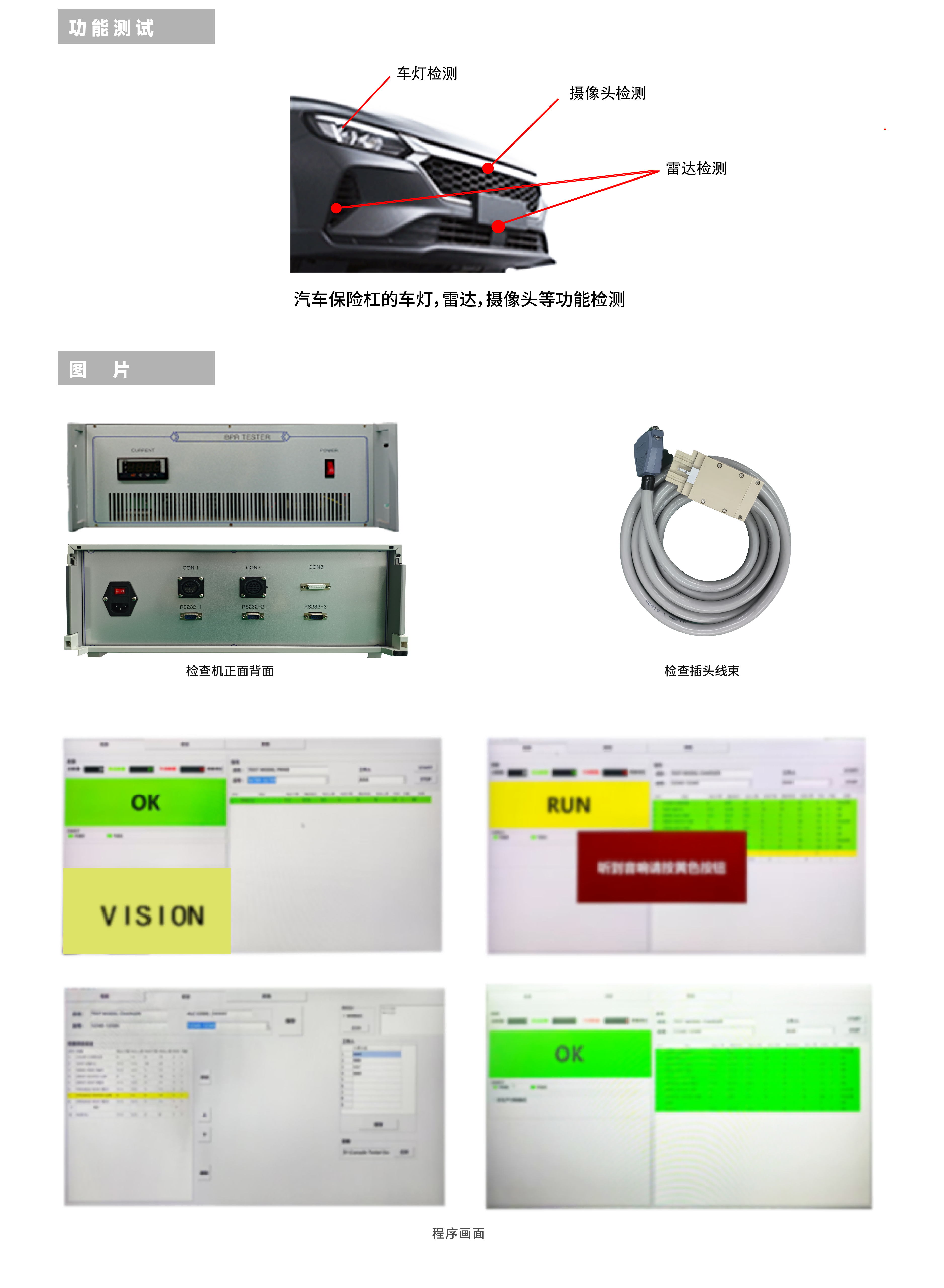 汽车保险杠部件功能通电检测机• 创造测试环境,可通电检测汽车保险杠零部件的功能,主要检测: - 汽车保险杠零部件包括摄像头,天线,雷达,车灯等 • 可检测LIN/CAN通信连接的部品功能• 支持与MES系统连接• 可防错 • 可根据需要定制检测程序 • 可按需加装各种硬件 - 可加条码打印机,扫描枪 等