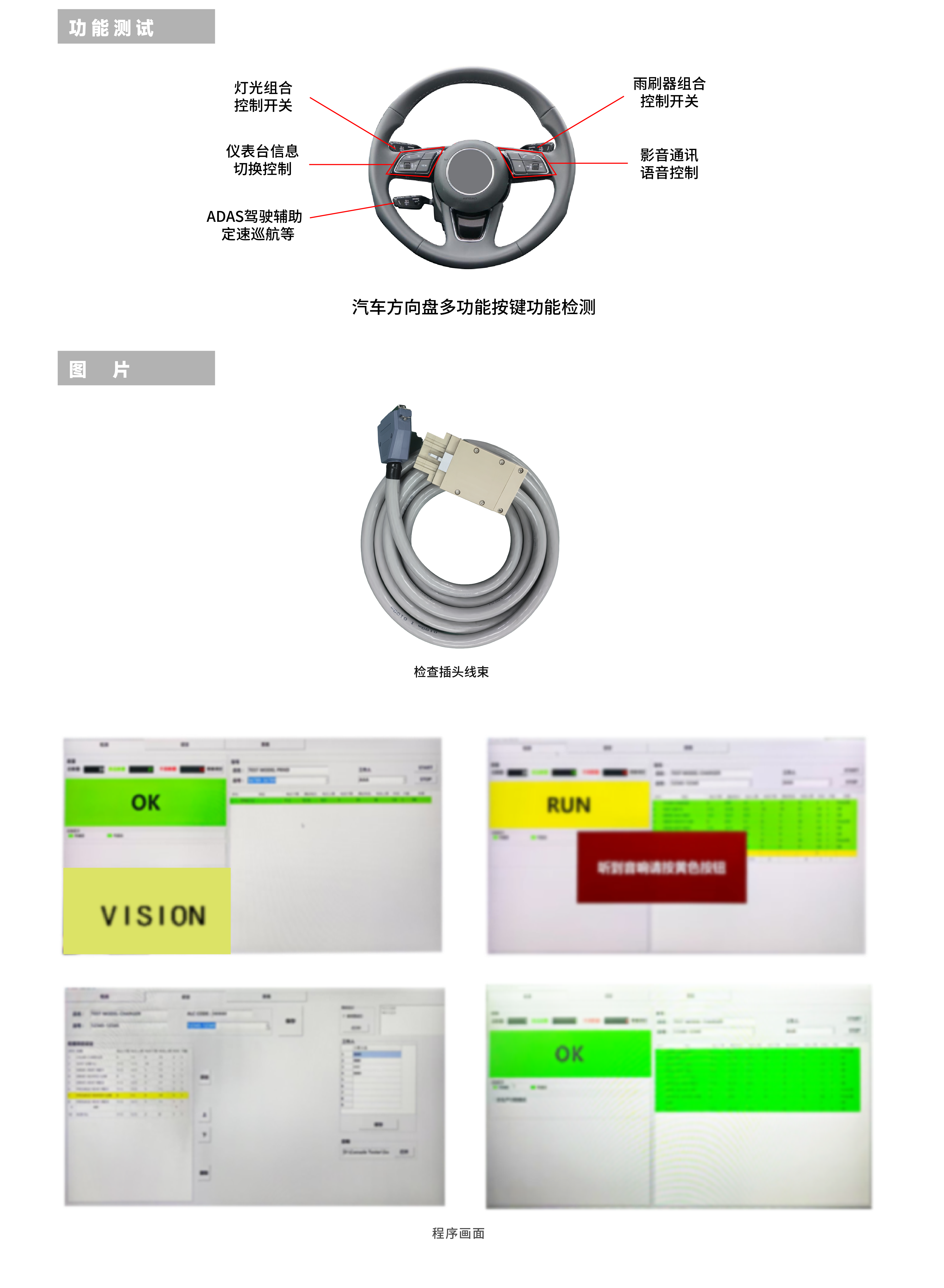 • 创造测试环境,可通电检测汽车方向盘按键的功能,主要检测: - 灯光、雨刷器组合开关,仪表台信息切换,影音通讯语音控制,ADAS驾驶 辅助,定速巡航按键等 • 可检测LIN/CAN通信连接的部品功能• 支持与MES系统连接• 可防错 • 可根据需要定制检测程序• 可按需加装各种硬件 - 可加条码打印机,扫描枪 等